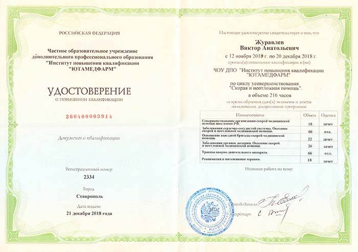 • 2018 г. – Повышение квалификации: ЧОУ ДПО "Институт повышения квалификации Ютамедфарм" (Скорая и неотложная помощь).
